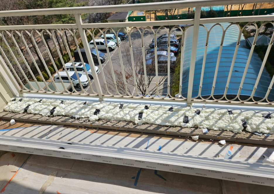 네… 그만큼 많이 뿌려주셔야 하부 시멘트에서 샤시로 차가운 공기가 전달되는 것을 방지할 수 있습니다. 이제 바닥에서 물이 새는 것을 방지하기 위해 상단에 컬러 플레이트를 놓습니다. 그리고 안쪽에 시멘트가 보이는 부분은 나중에 샷시 프레임을 위에 올려놓고 폼을 다시 쏴줍니다.